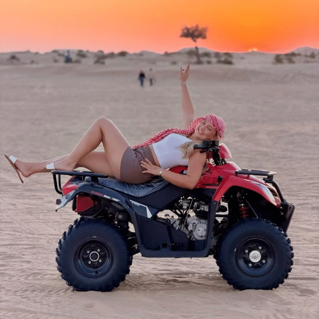 Our Desert Safari Abu Dhabi tour starts when we pick you up and drive towards the desert. Your Arabian journey begins with thrilling dune bashing over the high red dunes — a heart-pounding experience where you’ll feel the real adventure of the desert. After the ride, you’ll stop to capture the beautiful sunset view, perfect for photos and relaxation.